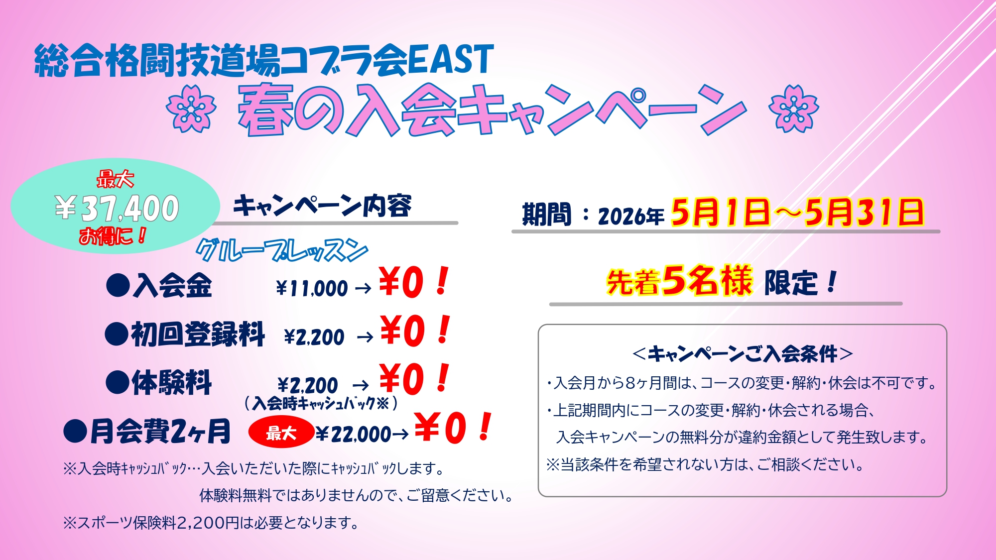 ・体験料¥2,200(入会時キャッシュバック)→ ¥0